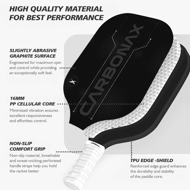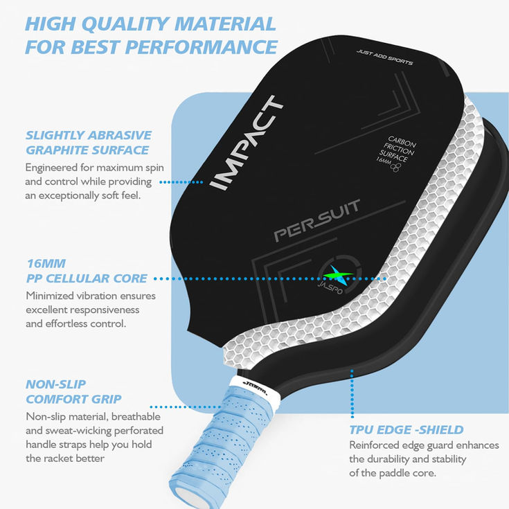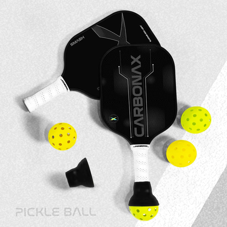 Jaspo Pickleball Paddle Set – Carbonax, Impact, and Breeze models, 16mm carbon fibre with PP honeycomb core. Includes 2 lightweight paddles, 4 pickleballs, and a carry bag
