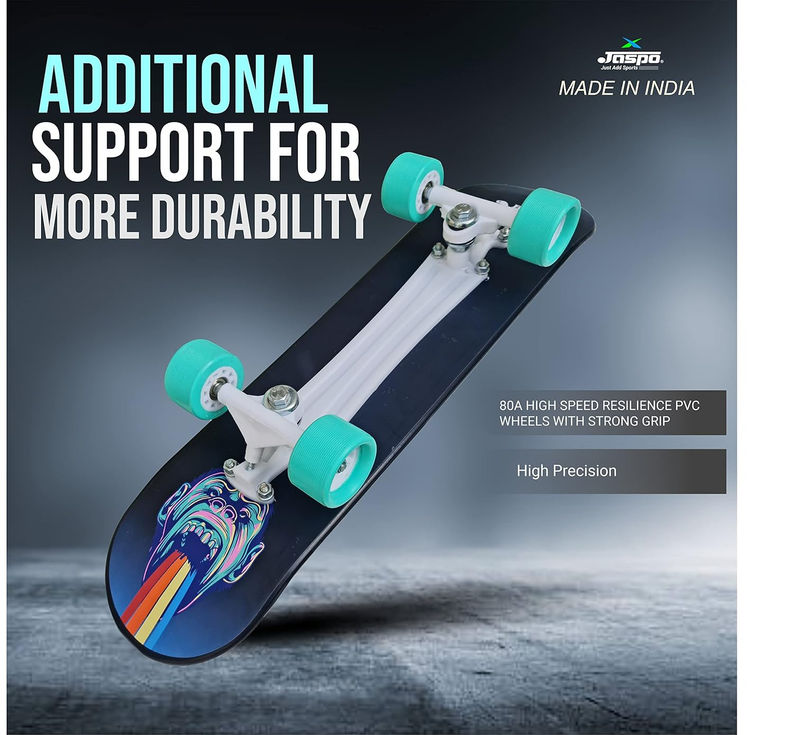 Jaspo Black Duck (26� X 6.5�) Complete Fiber Skateboard (Suitable for All Age Group). It can handle weight upto 75kg. So, people of all age can ride this skateboard. Anti- Shock soft PU Bushings and high-precision ball bearings.This skateboard has length: 26 and width:6.5. It is made up of fiber that will provide you smooth and attractive rides. On this skateboard you can enjoy the smooth rides with family and friends. Now you can cruise through the town with modish skateboard.It has high-precision ball bearings and its wheels are made up of PVC material. Wheel hardness is 61mm that will give you smooth and comfortable rides. It will come to you fully assembled, so there is no issue of assembling.This skateboard has different and attractive graphics that will attract you to take a ride. You can also show off to your family and friends its unique graphics. This skateboard is designed to be durable, lightweight, and easy to handle.The Jaspo Black Duck Complete Fiber Skateboard is a great choice for anyone looking for a high-quality skateboard at an affordable rate. Whether you're a beginner or an experienced skateboarder, this skateboard is sure to provide hours of fun and enjoyment.