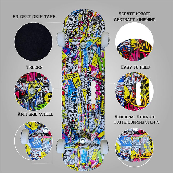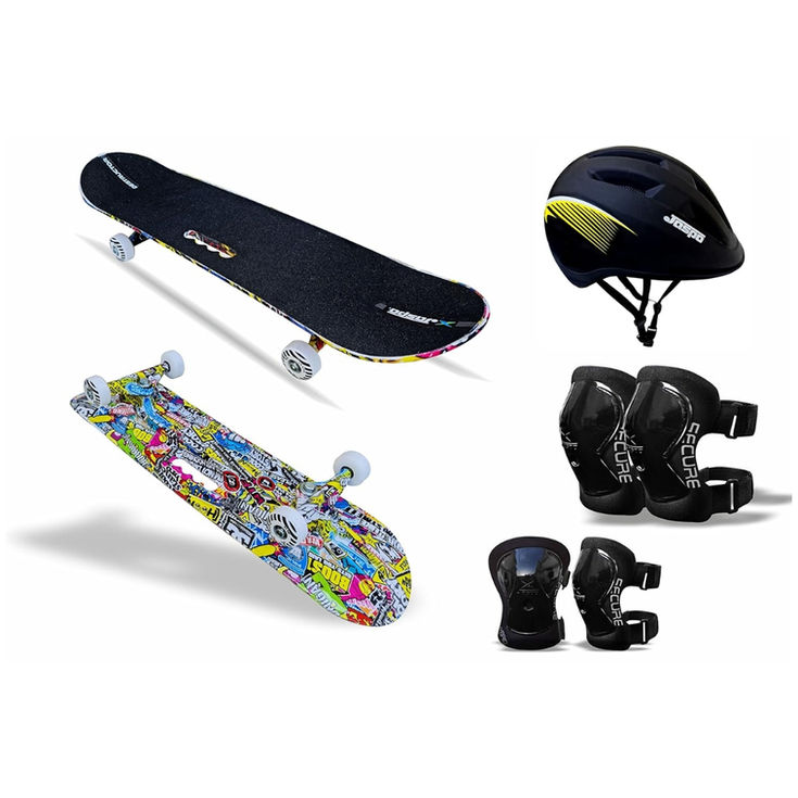 If you want smooth rides with unique style then have this! It has very unique designs that add up style to your life. You can show off to your family and friends its unique designs. We use hydro-graphic printing to make it more attractive to you. We choose the designs according to latest trends and with unique patterns. 31�X8� inches skateboard with a thick, durable light weighted Fiber Deck and Rounded Edges. 55mm polyurethane-injected wheels with hardness of 95 A and ABEC-7 608zz Bearings deliver a smooth ride on any surface. Heavy duty 4 inches Height and 8 inches Fiber trucks and polyurethane-injected bushings support higher weight and faster speed. High angle gravity cast trucks perfect for carving and aggressive riding. Perfect product for gifting purpose too. You can gift it to your family and friends they will like it. Best adhesion and grip designed for skateboard riders of all levels. Improves rider's grip which leads to better tricks and greater safety. Heavy duty material fiber skateboard with handling support up to 220 lbs i.e 100 kg. Good way to cruise through the town even at busy roads and have fun with full safety guards. Contains: skateboard, Helmet, knee, elbow &wrist guard. Smooth and Comfortable Rides Durable light weighted deck Polyurethane-injected wheels Pro-Grip Tape Protective guards