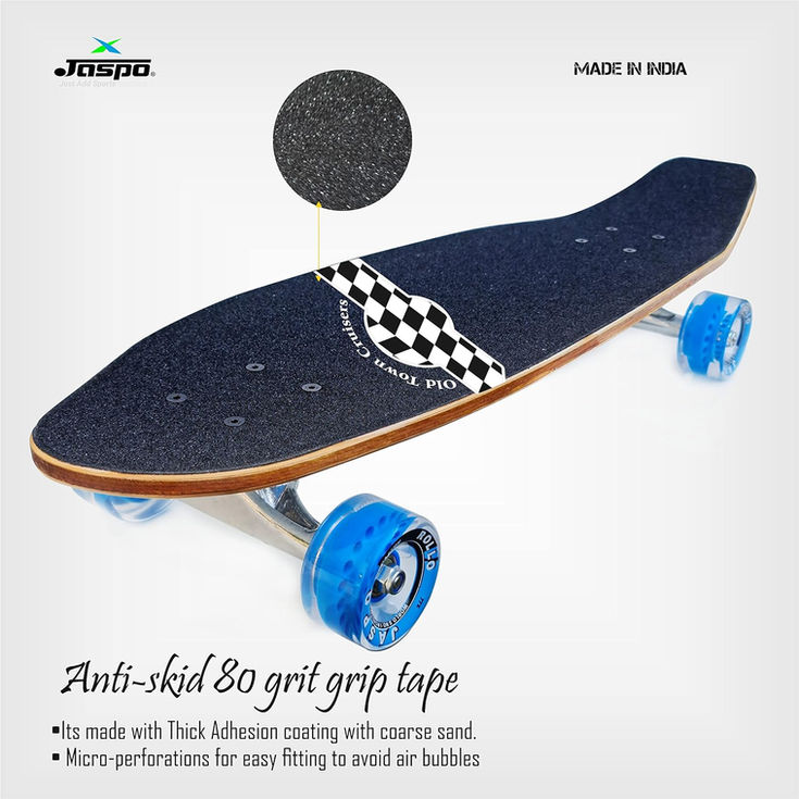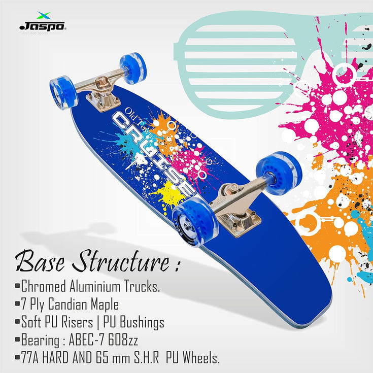 PRODUCT DESCRIPTION Jaspo Bad Binny Board is built with Adaptable and sturdy 7-layer Canadian Maple wood. It gives the Best Riding Experience for all riders. Smooth, Lightweight, Comfortable Skateboard with Aluminium Trucks. It holds up to 220 lbs and suitable for kids, Teenagers, Beginners and Professionals. Best Grip is designed for all levels of riders.80 grit grip tape is utilized for making the skateboard. TECHNICAL SPECIFICATIONS Size: **28 x 8 Inches board** Board: **7 Layer Canadian Maple** Trucks: **Aluminum Trucks** Bearings: **ABEC-7 608zz** Wheel Hardness: **77A S.H.R** Wheel Size: **65 mm** Support Weight: **Max 100kg/220 LBS** Recommended For: **Kids/Boys/Girls/Youth/Adult/Beginners** Product Weight:2.4 Kg Manufactured: **MADE IN INDIA** IN THE BOX CONTENT: **1 SKATEBOARD WITH T-TOOL** ABOUT COMPANY Jaspo Since 1960 has been making great sporting goods for nearly 60 years. Quality and fun is our ongoing legacy. Our company continue the tradition of providing great products for great experience. What is in the box? 1 Cruiser Skateboard