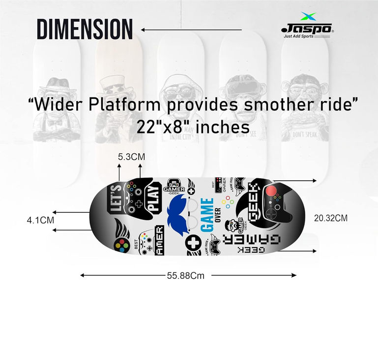 PRODUCT DESCRIPTION 7-Layer Maple Deck Skateboard decks are typically made from Canadian maple. 54mm TPU Wheels This is a great size for starting out, particularly for younger skaters. Wheels of this size are suitable for any type of street and transition skateboarding. Aluminium Trucks The truck comes in silver and has a high performance. While durable, it is perfect for nearly all types of skateboarding. Technical Specifications Deck Material: 7 Layered maple skateboard deck Wheels: 54 mm TPU wheels Bearing: ABEC-7 Trucks: Aluminum Supporting Weight: 100KG Origin: MADE IN INDIA In the Box Content: 1 Skateboard with T-Tool. ABOUT JASPO Since 1960, Jaspo has been making great sporting goods for nearly 60 years. Providing quality product to our customers. Our company continue the tradition of providing great product for great experience.