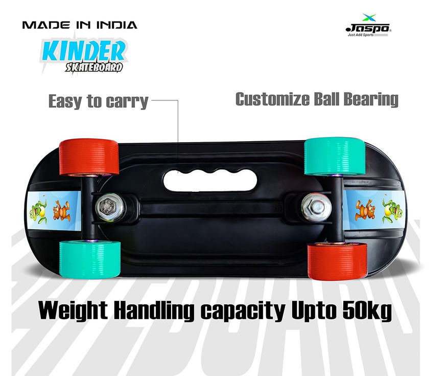 Jaspo Kinder 18"x6" Junior Skateboard is designed specifically for kids up to 7 years of age who are beginners or learners in the world of skateboarding. It is a versatile board that combines elements of a caster board, sense, hoverboard, and longboard to provide a unique riding experience for young children. The skateboard has a length of 18 inches and a width of 6 inches, making it compact and lightweight. This size is ideal for younger kids as it allows them to maneuver the board more easily and maintain better control over their movements. It features a stable and sturdy construction that helps kids maintain their balance while learning to ride. Jaspo Kinder 18"x6" Junior Skateboard is designed to provide young children with a fun and safe introduction to skateboarding. Jaspo Kinder 18"x6" Junior Skateboard is an ideal choice for young children who are starting their skateboarding journey. Its size, materials, load capacity, wheel size, and durometer hardness are all carefully chosen to provide a safe and enjoyable experience for young riders, helping them build confidence and develop their skateboarding abilities.A durable kids' skateboard should have an appropriate weight capacity to accommodate the rider's size and weight. It's important to check the manufacturer's specifications to ensure the skateboard can handle the intended rider's weight without compromising its structural integrity.
