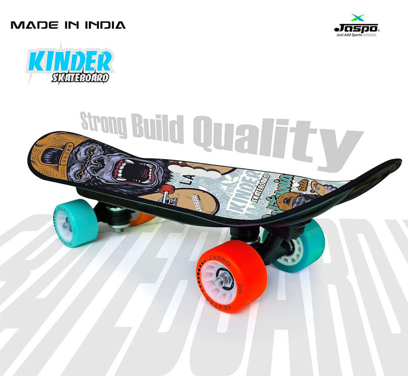 Jaspo Kinder 18"x6" Junior Skateboard is designed specifically for kids up to 7 years of age who are beginners or learners in the world of skateboarding. It is a versatile board that combines elements of a caster board, sense, hoverboard, and longboard to provide a unique riding experience for young children. The skateboard has a length of 18 inches and a width of 6 inches, making it compact and lightweight. This size is ideal for younger kids as it allows them to maneuver the board more easily and maintain better control over their movements. It features a stable and sturdy construction that helps kids maintain their balance while learning to ride. Jaspo Kinder 18"x6" Junior Skateboard is designed to provide young children with a fun and safe introduction to skateboarding. Jaspo Kinder 18"x6" Junior Skateboard is an ideal choice for young children who are starting their skateboarding journey. Its size, materials, load capacity, wheel size, and durometer hardness are all carefully chosen to provide a safe and enjoyable experience for young riders, helping them build confidence and develop their skateboarding abilities.A durable kids' skateboard should have an appropriate weight capacity to accommodate the rider's size and weight. It's important to check the manufacturer's specifications to ensure the skateboard can handle the intended rider's weight without compromising its structural integrity.