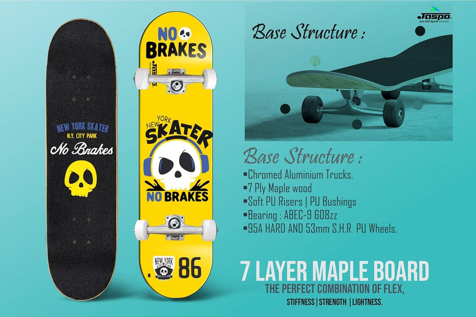 Jaspo NO Brakes 31x8" Inches Canadian Maple 7-layer Skateboard - Made in India.