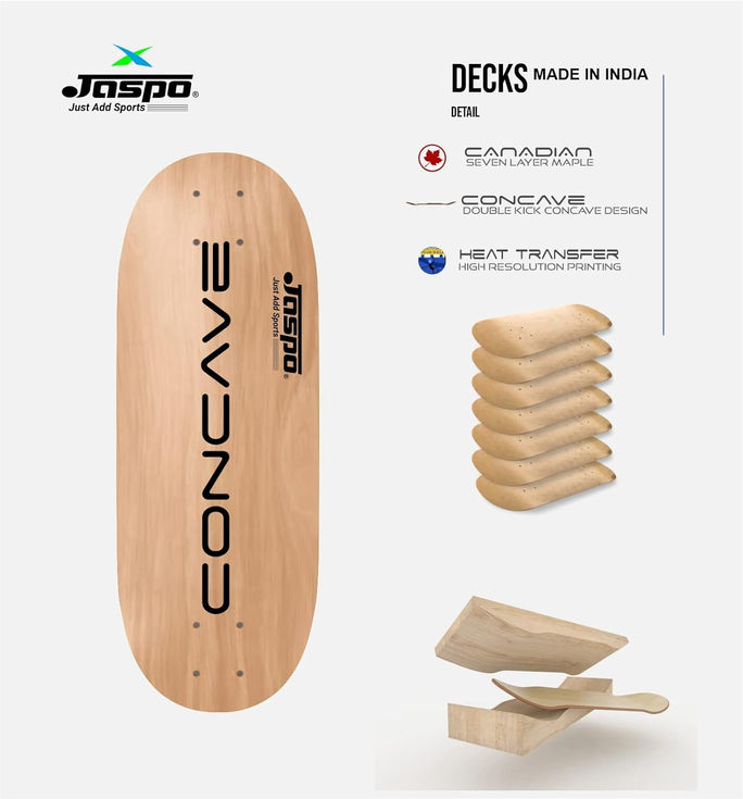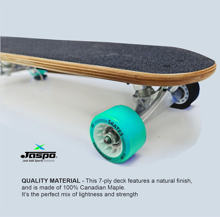 PRODUCT DESCRIPTION 7-Layer Maple Deck Skateboard decks are typically made from Canadian maple. 54mm TPU Wheels This is a great size for starting out, particularly for younger skaters. Wheels of this size are suitable for any type of street and transition skateboarding. Aluminium Trucks The truck comes in silver and has a high performance. While durable, it is perfect for nearly all types of skateboarding. Technical Specifications Deck Material: 7 Layered maple skateboard deck Wheels: 54 mm TPU wheels Bearing: ABEC-7 Trucks: Aluminum Supporting Weight: 100KG Origin: MADE IN INDIA In the Box Content: 1 Skateboard with T-Tool. ABOUT JASPO Since 1960, Jaspo has been making great sporting goods for nearly 60 years. Providing quality product to our customers. Our company continue the tradition of providing great product for great experience.