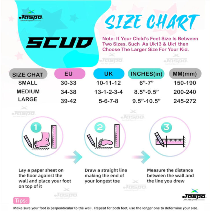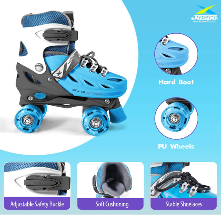 Jaspo Scud X Trail Adjustable LED Quad Skates with PU wheels, durable sole, and vibrant lights, ideal for indoor/outdoor use. Available in Blue-Grey, Purple-White, and Black-White, sizes Small, Medium, and Large.